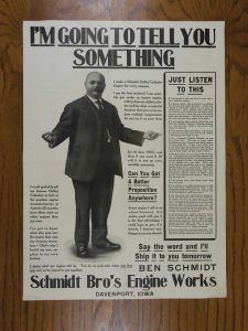 A Schmidt Bros. Engine Works poster showing both the hopper-cooled and air-cooled engines.
