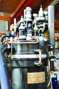Surprisingly, this does have an advantage. The compressor can be powered by another source such as a small engine, or in this case, an electric motor. Hence, the tanks can be filled for starting, then the belt reconnected to the engine to maintain operating air. A vintage electric motor is used as an alternative power source for the compressor, and we can fill both the Graz and Augsburg tanks. CPM had just the right motor.