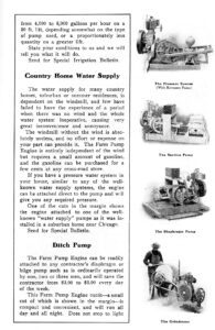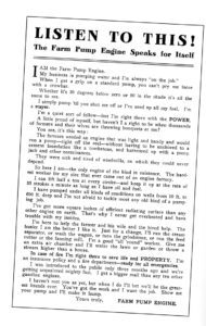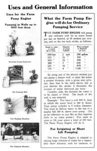 The sales pitch emphasizes the downsides and unpredictability of windmills, stating they are fast disappearing from farms for good reasons. “Perhaps the most discouraging feature of all is the uncertainty of the wind itself. When the weather is the hottest, and the stock needs the most water, the wind persists in staying in some other part of the country for weeks at a time. You who have had the experience of pumping by the hour under such conditions, the perspiration streaming from every pore, will require no further argument as to the actual NEED of the farmer for the Farm Pump Engine.”