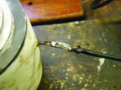 Car jump cables were used to connect the battery to the charger. To make it easy to use the large alligator clips, two pieces of 1-inch brass were turned with a groove before cross drilling with the 0.188-inch hole for the 6 AWG cable to be used to connect the power source for distribution to the coils (see photo). Finally, 2-by-