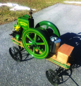 While it was apart, I painted it then reassembled it. I had to build a new cart. The gas tank is made from 6-inch stovepipe end caps soldered with fittings. I tried to keep it as close to original as possible. The gas line is made from a 1/4-inch copper tube and soldered. I made a new crank guard.