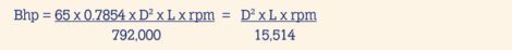 The final step is to convert the (in – lb)/min value into familiar horsepower. By definition, one horsepower equals 550ft-lb/second, or 33,000ft-lb/minute, or 396,000in-lb/minute. Here, we simply change units, knowing that 60 seconds = 1 minute and 12 inches = 1 foot. The final formula is found by multiplying power by the equivalent 1bhp = 396,000in-lb/minute:
