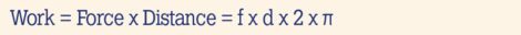 Pi (π = 3.1416) is the same constant used before and is used to calculate the distance around a circle — the flywheel in this case. The distance traveled by the opposing force (f) during one flywheel revolution is d x 2 x π. Remember that: