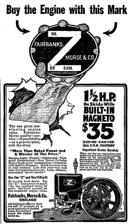 The Fairbanks Morse Co. began producing oil and gas engines in the 1890s by purchasing the Charter engine line. The Charter line featured the first commercially available gas engines. For its versatility, the small hit-and-miss engine became a success with farmers.