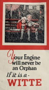 Bob and Jim most often used compressed air or belted the engine to a tractor to help get it started. After a minor tune-up and some research to track down the original instruction manual, I was able to learn how to start the monster by myself by turning the flywheels using the “back-kick” method. The engine continues to run well and most of the time it starts without much work. When running, the sheer size of the flywheels and the cylinder, combined with the loud noise of the engine, attracts quite the crowd at the farm shows. I am happy to be the caretaker of this fine example of Witte history and to continue the work of my friend Jim.