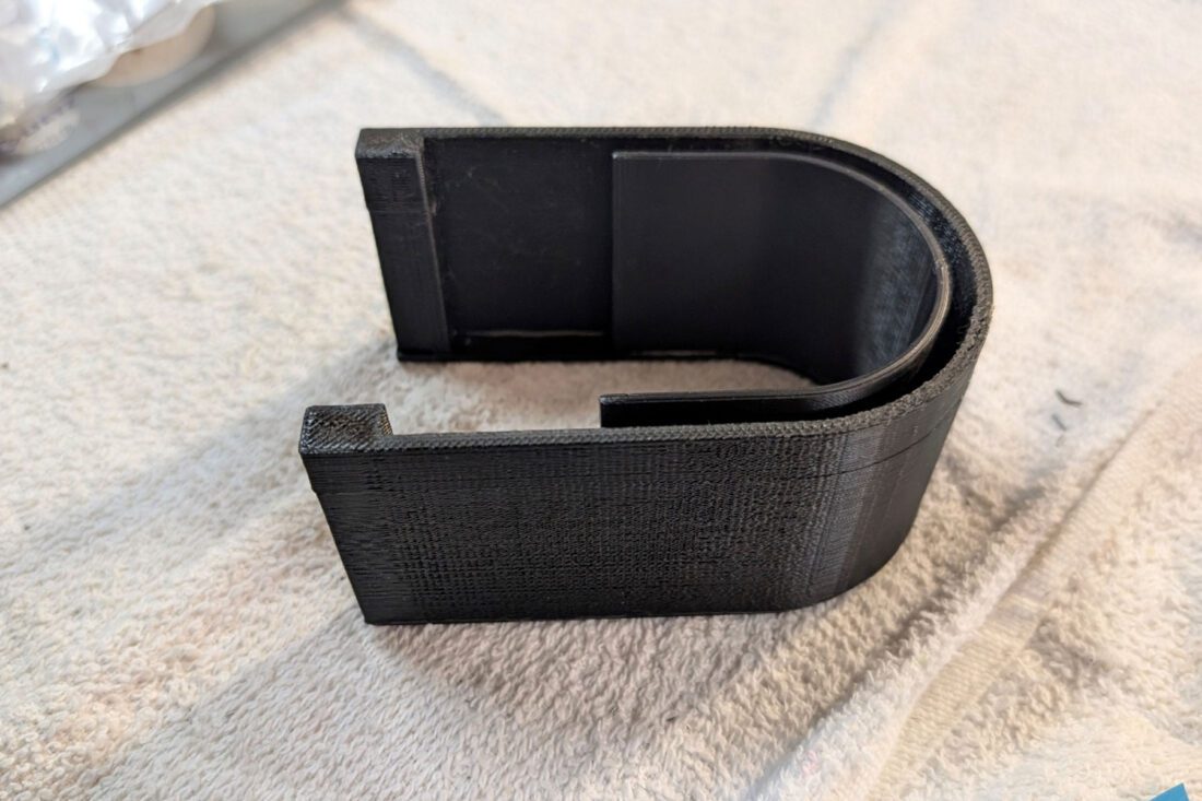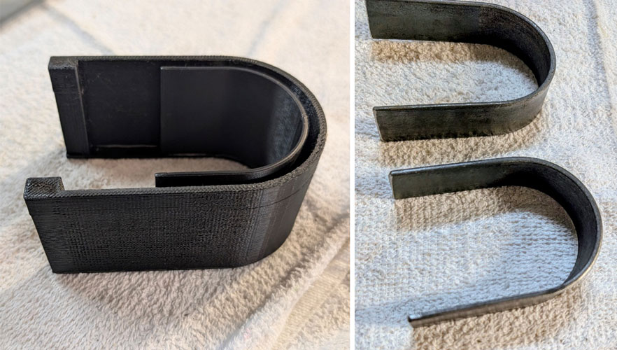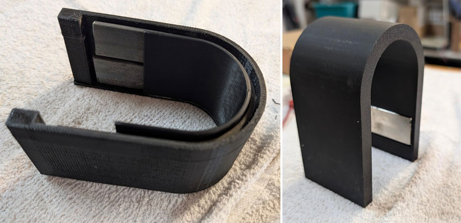 After more experiments, it became clear that to meet or exceed the usefulness of any OEM magnet, the printed horseshoe magnet must contain a solid iron core and likely receive its magnetism from rare earth magnet inserts, similar to the Evac magnet cited above. It’d be convenient if a thick horseshoe-shaped, 2-inch wide piece of bar stock could be placed on the printer table and have the printer print around it. Unfortunately, the large print head of all printers has virtually no head room, maybe 0.100 inch. As the printer tried to print the lower slices, it continually banged into the metal.