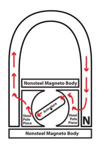 Early magneto companies adhered to those three rules, resulting in the horseshoe magnet and the architecture we’re all familiar with. The magnetic field passes through the magnet into an iron pole piece in the magneto body, through the armature core, out through the other magneto pole piece and into the magnet where it started (Figure 1). The only difficult parts of that path are the two tiny air gaps between the pole pieces and the armature core. That path is by far the easiest for the magnetic loops to complete their path. A better way to produce a good magneto hasn’t been found. Any 3D printed magnet will likely need to be structured like the early magnets.