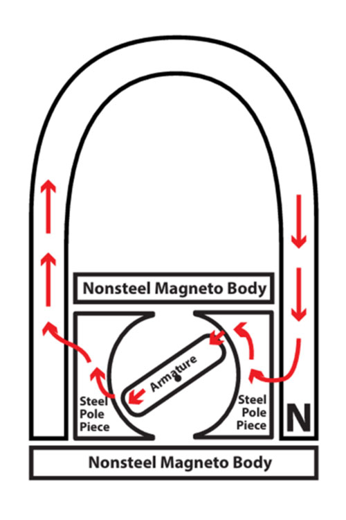 Finally, some materials are harder for magnetism to pass through than other materials. Air is very difficult but iron can be thousands of times easier. Magnetic field lines will always take the easy path. Therefore, in a magneto, the easiest path for a magnetic field line to complete its loop must include the armature core.