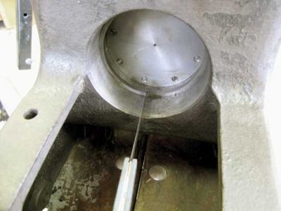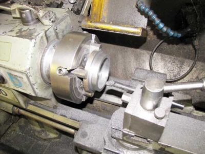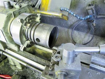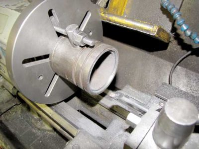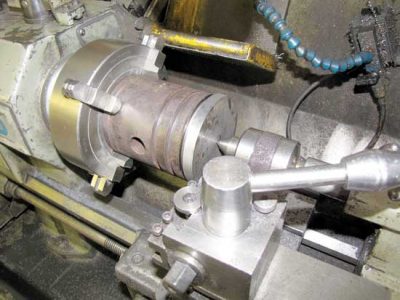 The next step was to true up the sawn end of the piston by facing it, removing the smallest amount of metal to get a clean, true edge. The second step was to form both the step and seat for the new crown by boring inside the piston. First, I made some 0.10-inch-deep cuts into the piston to get a clean surface so I could measure the wall thickness. There was a large variation in the wall thickness, which meant I would have to make some adjustment to my measurements that had been planned from the first examination of the piston.