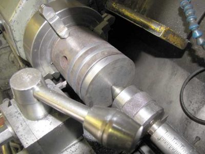 The first step was to set the piston square in the four-jaw chuck so that I could true the base of the piston, as this base would rest on the face plate. Before starting any further work on the piston, I measured the overall length so that after the repair it could be finished to this size.
