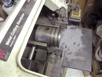 My first job on the piston was to saw off the old crown before mounting the piston on the lathe. There was no point in keeping the old crown in place to assist when setting up the piston on the lathe, as it had uneven wear.