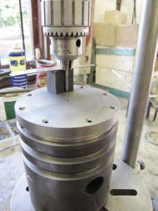 Once cool, I fitted the piston on the lathe using the four-jaw chuck and recentered it. When running true I cut a shallow tapered hole in the crown with the center drill so that the tailstock could be used to support it.
