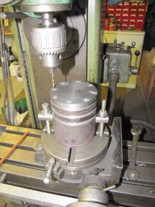 I fixed the rotary table to the milling machine table and then clamped the piston to it and centered it. I drilled the eight holes of tapping size, followed by the shorter clearance holes and finally used the countersink.