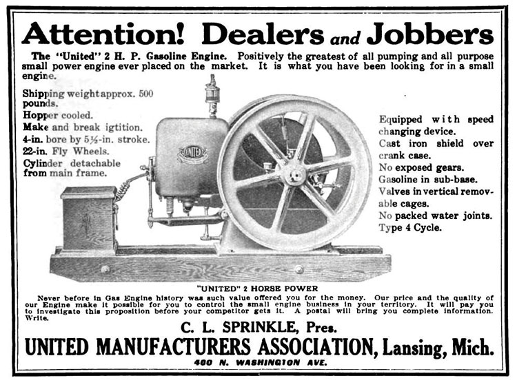 - United got its start in Jackson, Michigan, in 1910. They moved to Lansing in the late summer of 1911. Field Brundage was an established engine builder in Jackson, looking to add to their sales. Production of the Type B style engine was likely initiated late in 1910 and would end by 1912.